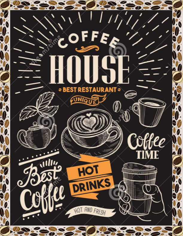 Like my classmate suggested, I raised the quality of the images that looked a bit lower res like the bread, beans, and ice cream, using CSP tools, I sharpened their edges a bit which helped them look less transparent or low res. Next, I edited the border a bit for consistency by removing the green squares and replacing them with the coffee beans. When I realized that the border was also very inconsistent and some of the edges were either cut off or digging into the menu page a bit I adjusted those mistakes(don’t know how my previous instructor and I missed that).