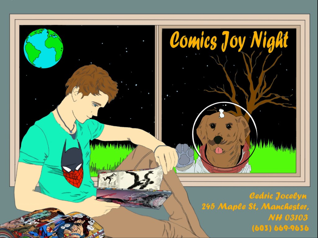 My instructor told me that pieces like typographic portraits are tough sells and including it would be a bad idea so I decided to follow along with those instructions and move along with something else. I went and pulled up a piece I had been working on with my logo design in mind but also wanted to use to advertise comics joy night. I used Clip Studio Paint, Indesign, and Illustrator for it. The logo was made in both CSP, ID, and AI and the fonts were ID. I used pieces that I worked on from all three softwares and tried to see what I could get from meshing them all together. But this was not a good idea, because, without a clear goal, your design will not know what direction it is heading in.